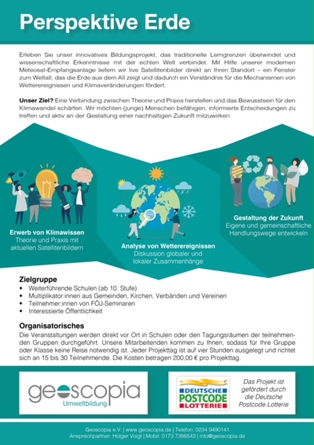 Wir erklären bildhaft anhand von Live-Satellitenbildern der Erde, wie sich diese in den vergangenen Jahren verändert hat und entwicklen gemeinsam mit den Gruppen Lösungen auf individueller, gesellschaftlicher und politischer Basis. Klimaschutz, Umweltschutz und Nachhaltige Entwicklung werden so nicht nur diskutiert, sondern in zukünftge Aktivitäten umgesetzt.