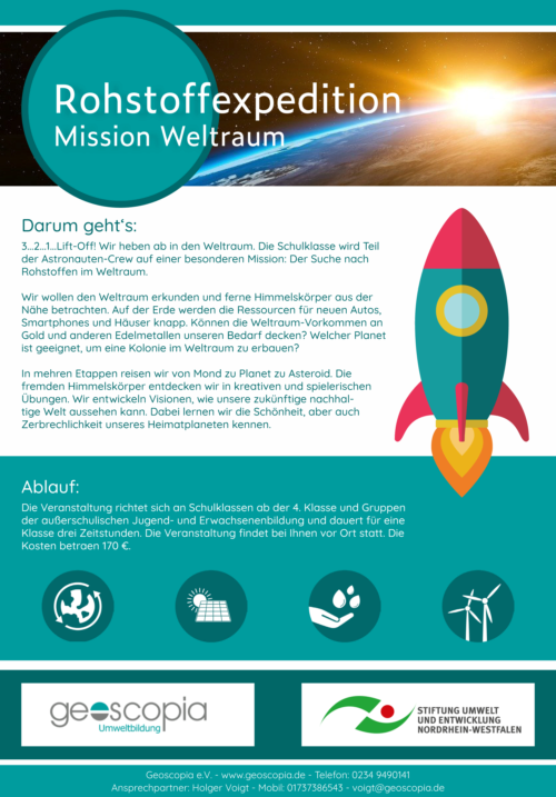 Für die Suche, den Abbau und den Verbrauch von Energie und Rohstoffen werden auf der Erde massiv Lebensräume zerstört, das Klima ändert sich und Rohstoffe werden knapp. Können wir nicht einen Planeten oder Mond mit vielen Rohstoffen finden, diese abbauen und zur Erde bringen? Dieser Frage wollen wir gemeinsam und interaktiv auf die Spur gehen. Mit Hilfe eines zielgruppengerechten Films gehen wir auf Weltraummission, um Lösungen für die Energie, Nahrungs-, Wasser und Klimaprobleme in unserem Sonnensystem zu finden.